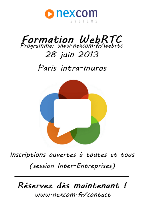 Cette évolution substantielle a incité NEXCOM Systems à proposer une session de formation WebRTC, ouverte à toutes et tous (inter-entreprises). Cette formation, se déroulant sur une unique journée, a pour objectif de familiariser les participants avec la technologie (que ce soit les protocoles, codecs, APIs WebRTC, …), mais également de les aider à appréhender les enjeux et le potentiel que cette technologie peut représenter pour un secteur d’activité donné (télécommunications, relations clients, …).